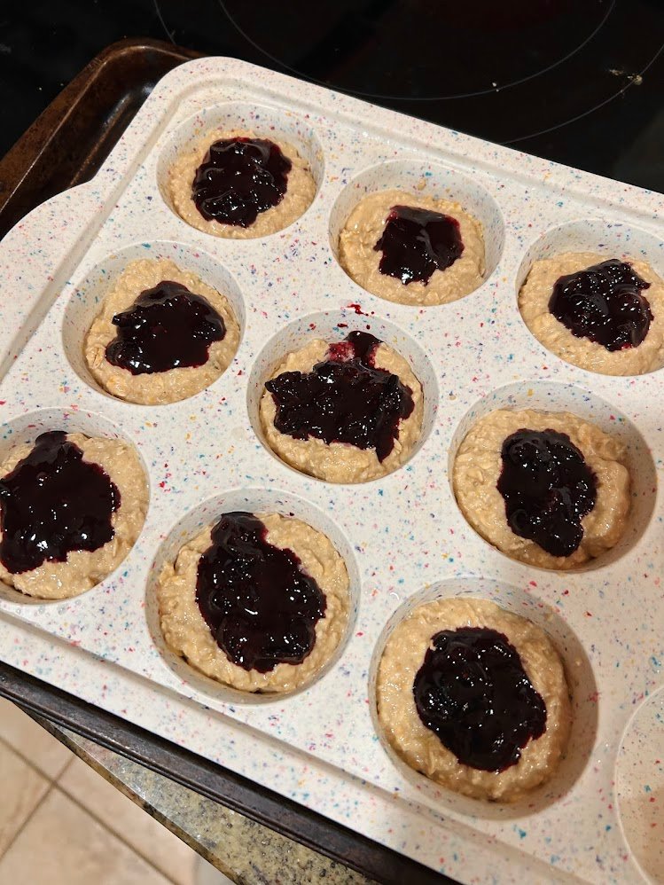 Filling the Muffin Tins: I would not overfill the muffin cups given the use of 2 topping elements. I would aim for about 3/4ths of the way full after adding the jam to prevent any possible overflow issues in the oven.