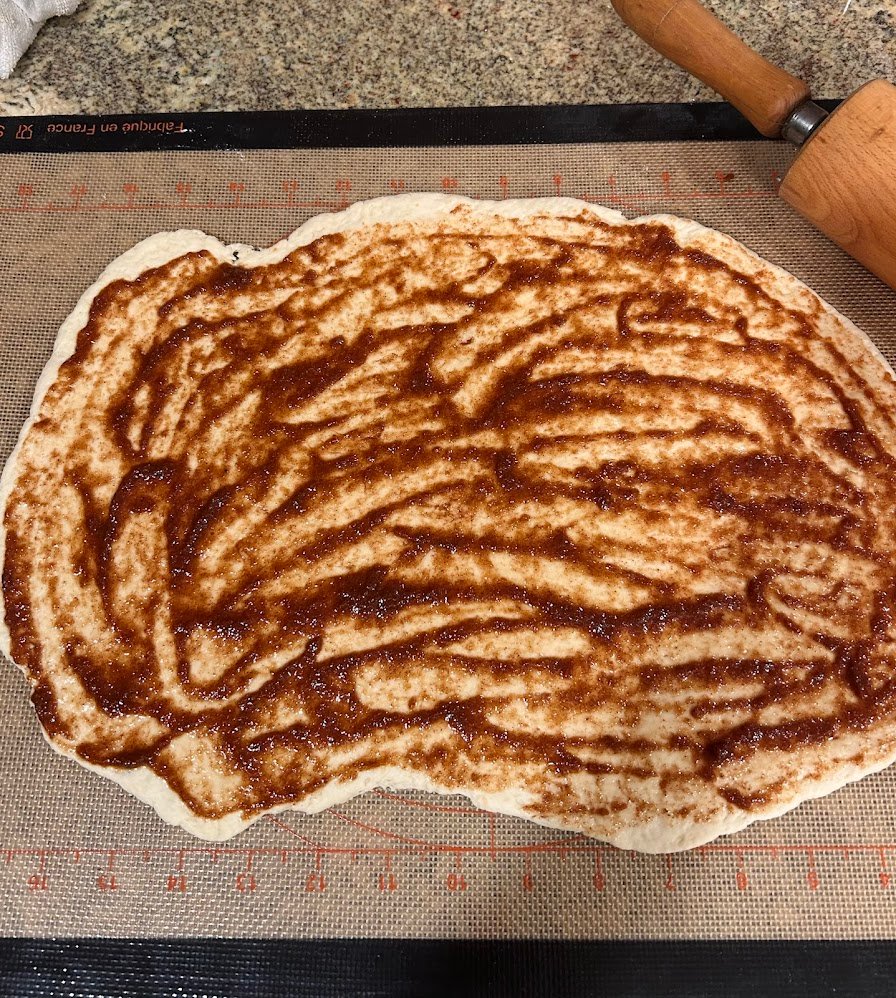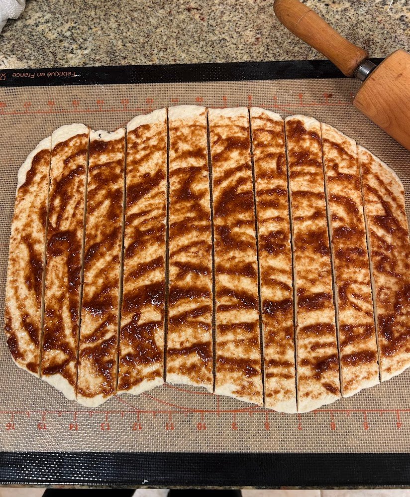 - Spread the cinnamon filling mixture across the dough as evenly as possible, then cut the dough from long side to long side into strips of your desired thickness. I typically get around 9 smaller rolls.