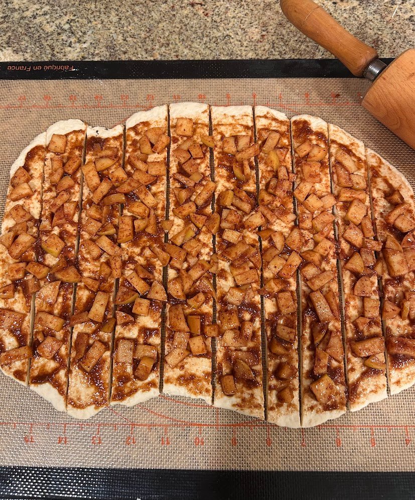 - Add the apple filling overtop of the cut dough and cinnamon mixture, creating an even layer of apples.
