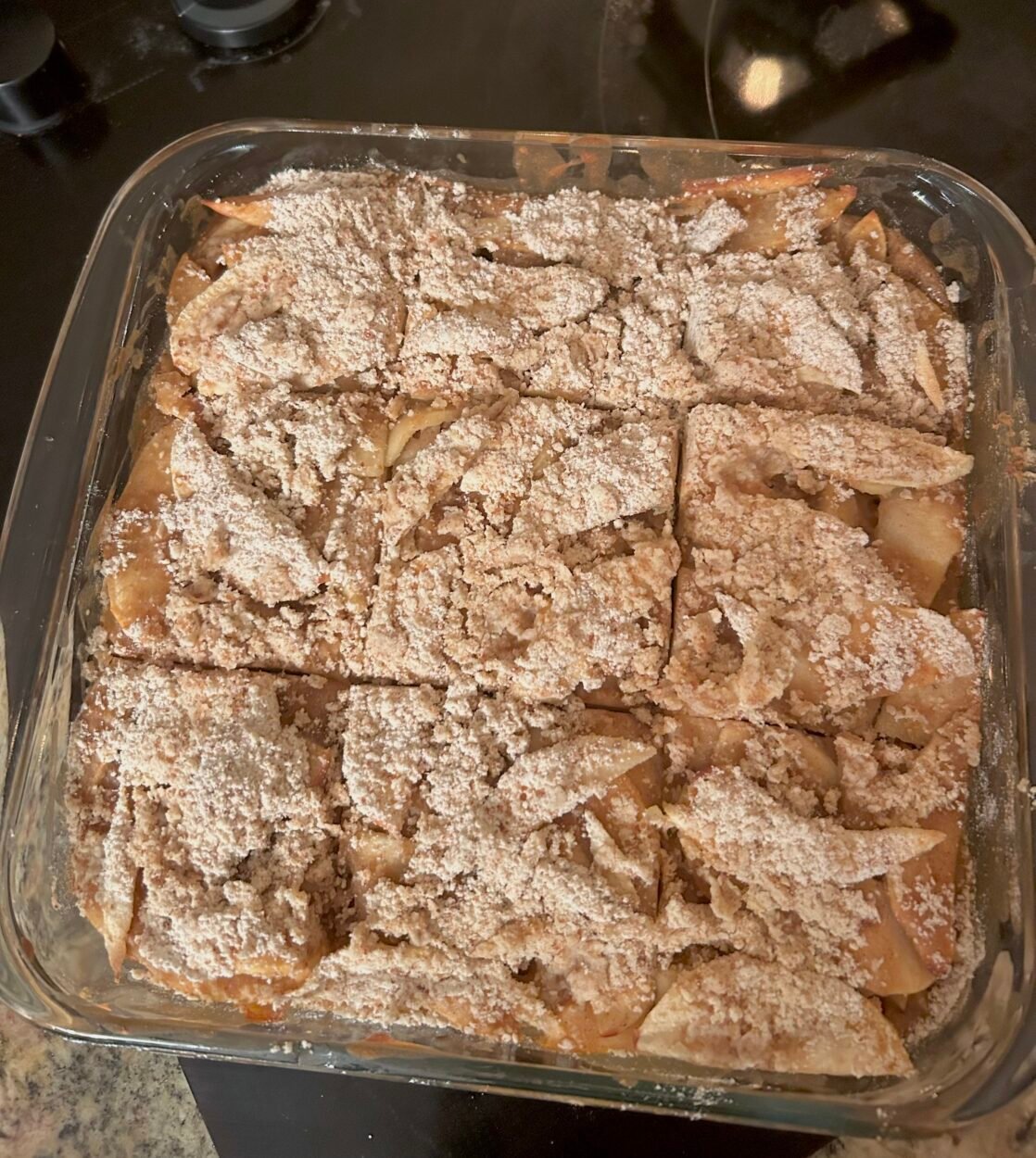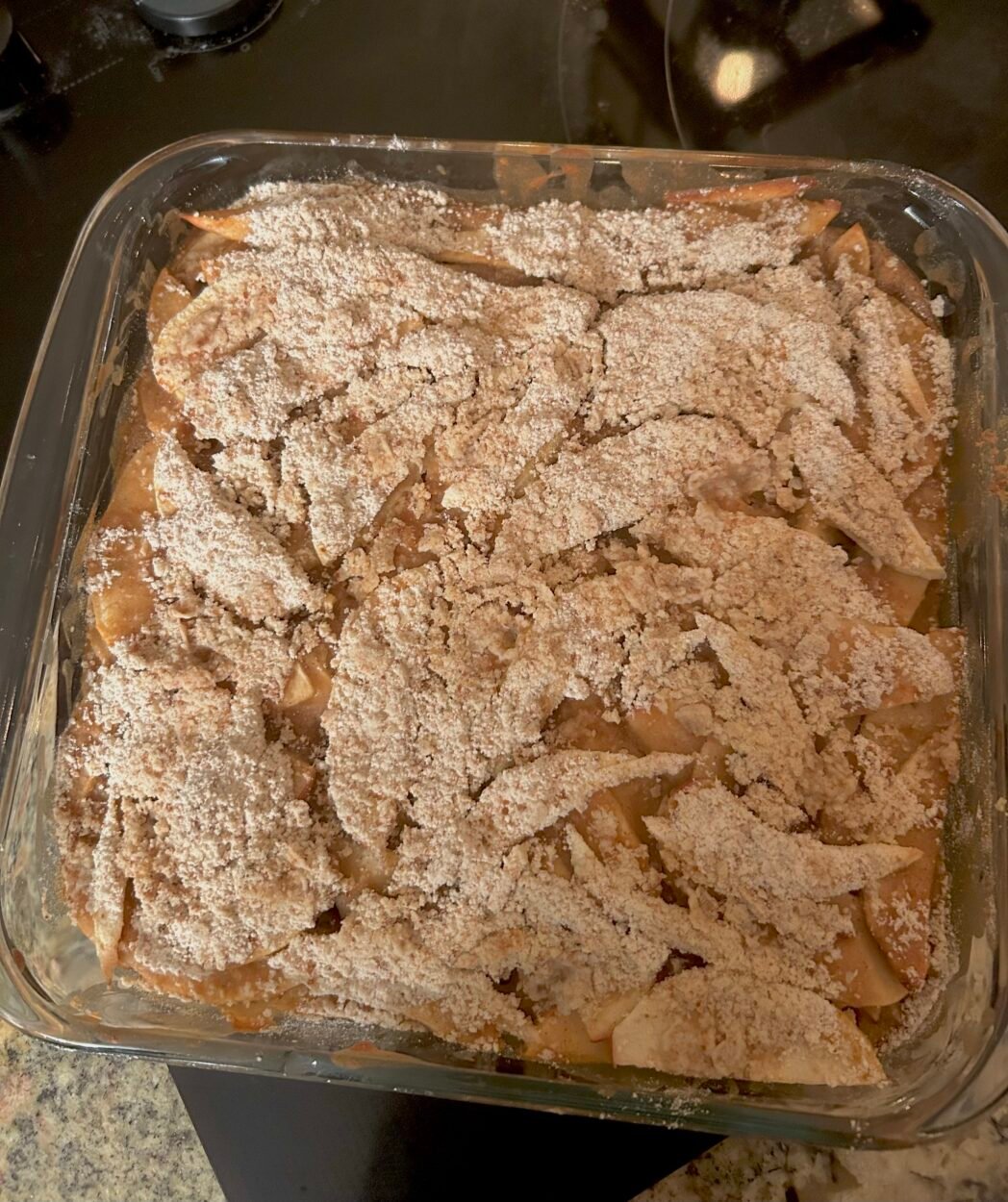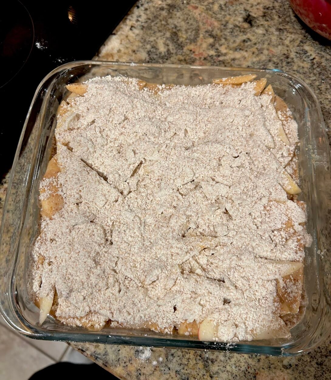 • Sprinkle the streusel mixture evenly over the apple mixture, then place the pan into the oven.