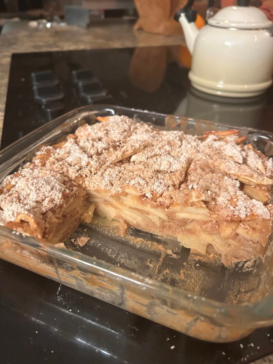 I love apples (I believe I’ve made that rather clear throughout this blog :)). It’s almost as if I am a dog hearing “treat” anytime the word apple is mentioned! And I most certainly cannot resist a recipe with them included. This recipe in particular is about 85% apples, so you can imagine my delight at the thought of it. It is very similar to the “Invisible Apple Cake” recipes I have seen before, although it has an additional streusel topping that makes it somewhat resemblant of pie. I don’t quite know how to describe it now that I sit and attempt to… but I do know that I find it to be one of my dearest recipes.