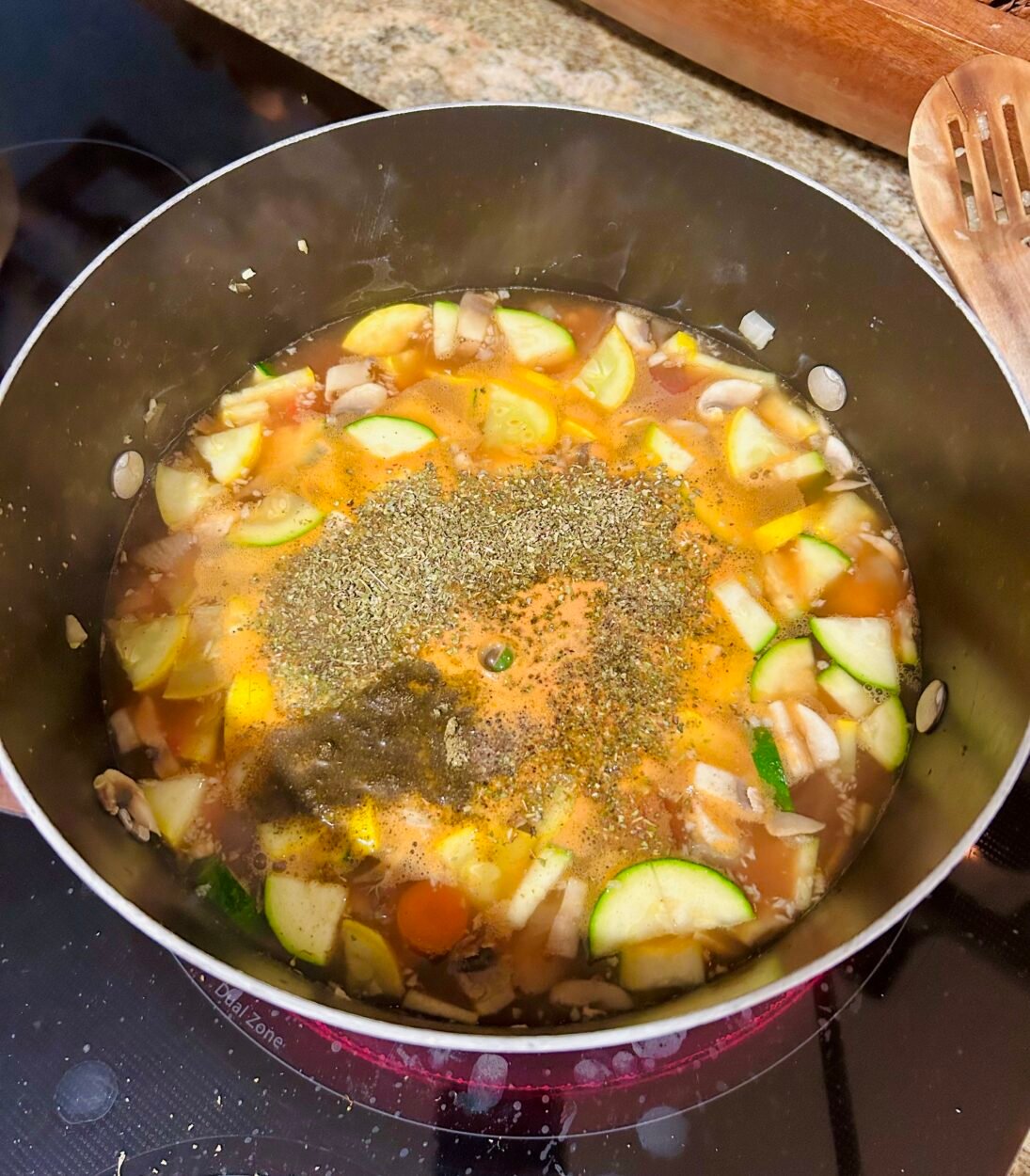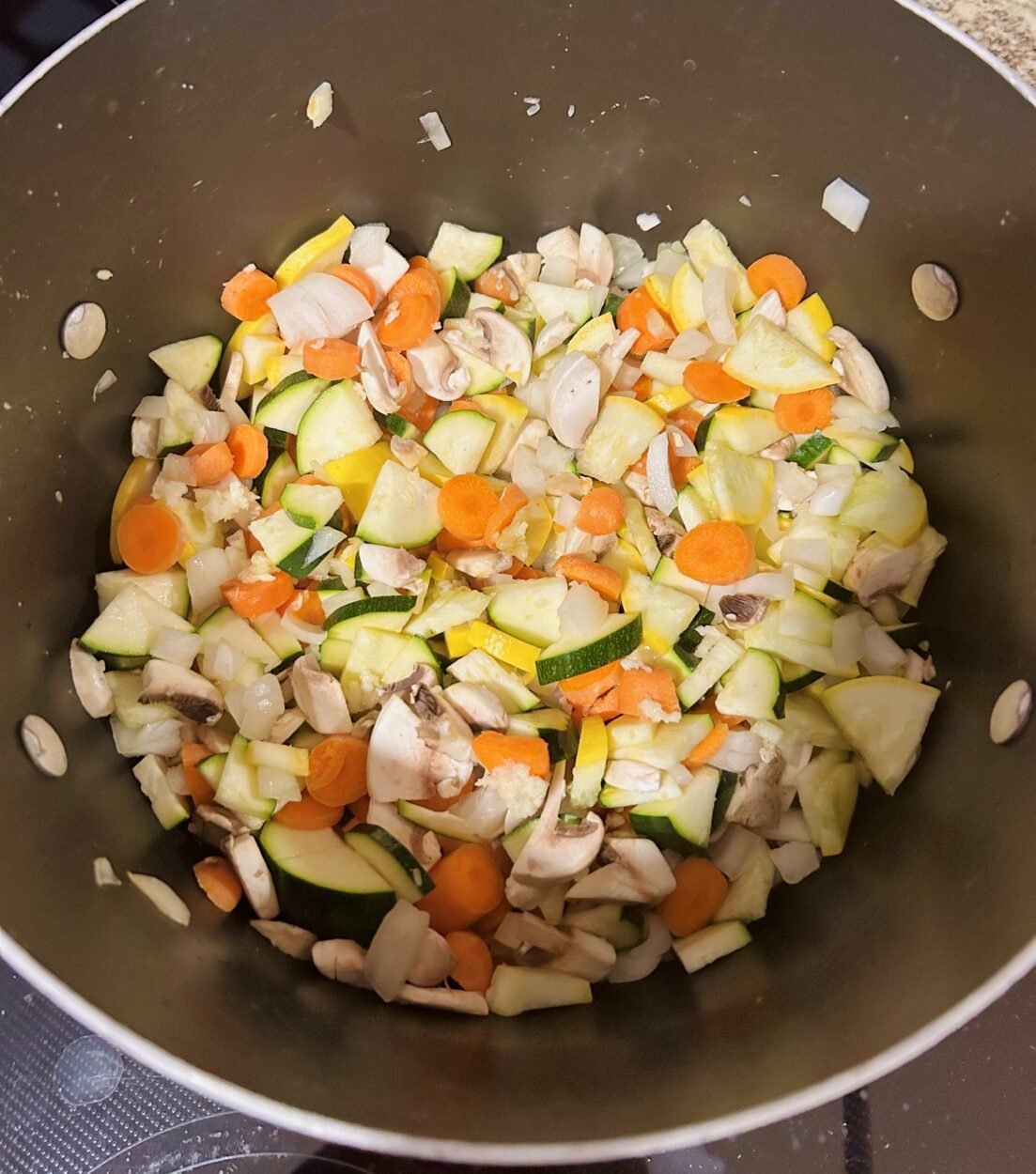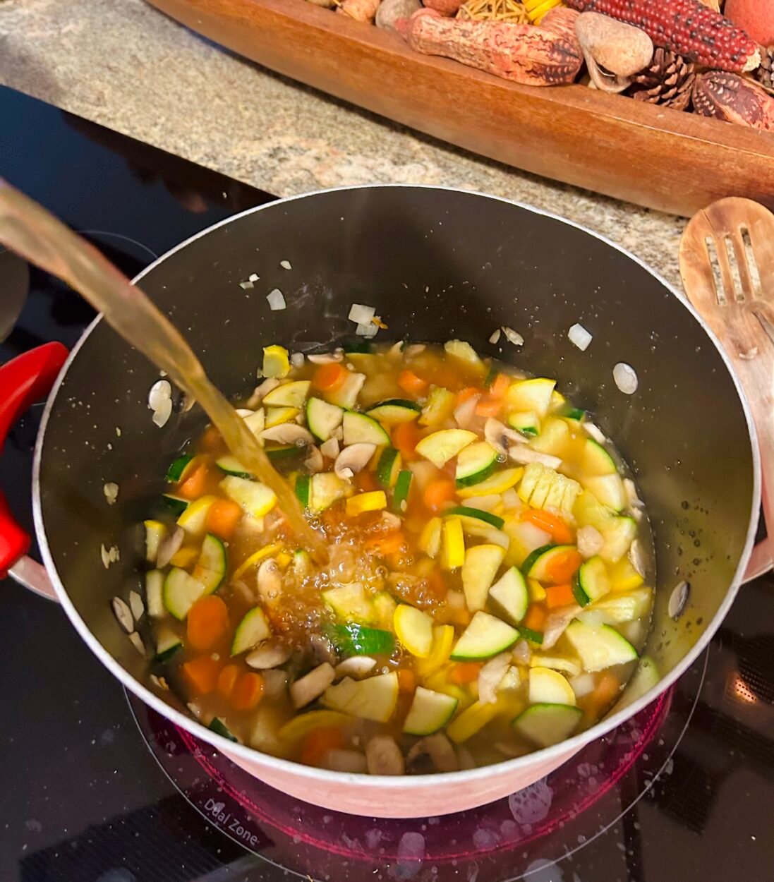 - Heat a medium pot with 1 tablespoon of olive oil to medium/high. At this point, prep your garlic to be minced. Add the onion, carrots, mushrooms, zucchini, celery, and minced garlic. Saute for 3-5 minutes, until vegetables begin to soften and the onion is translucent.