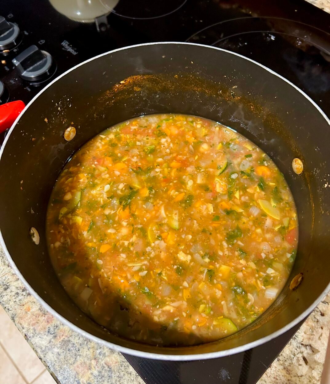 - Once the 15 minutes have passed, use an immersion blender to roughly chop/blend roughly 1/3 of the soup, until it appears somewhat cohesive and pulsed. Then enjoy!